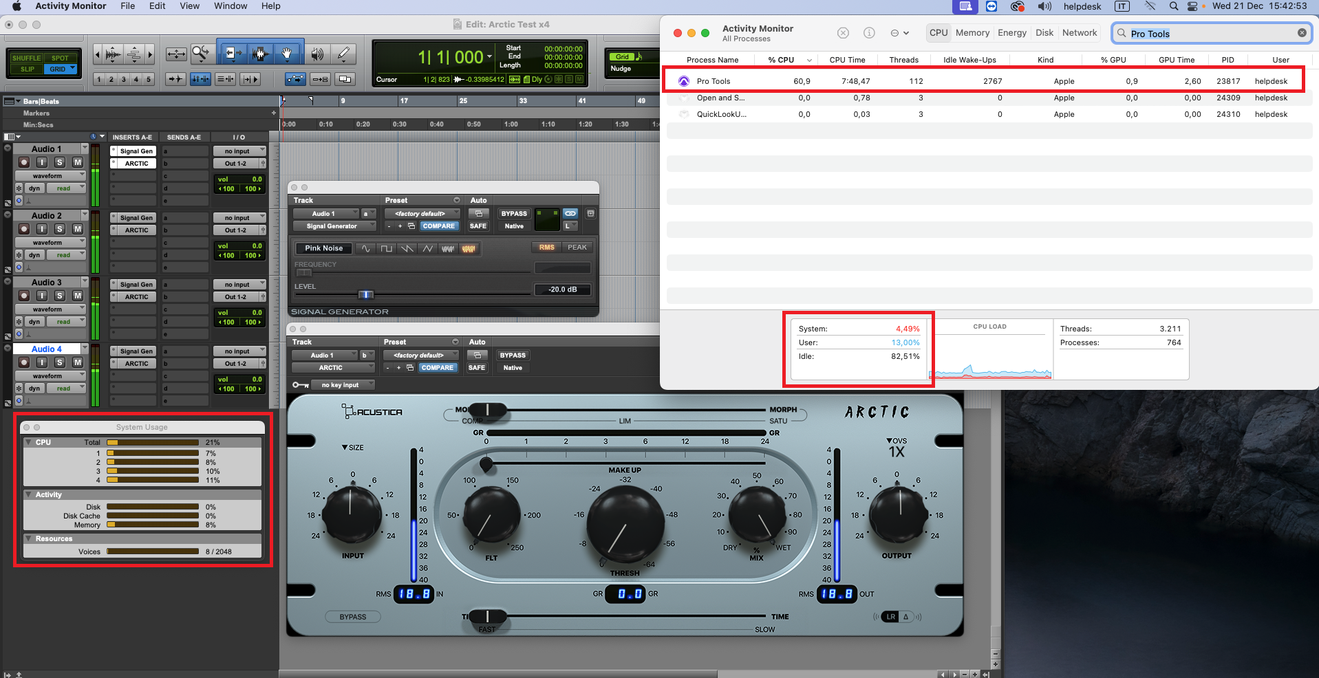 Use the macOS activity monitor to know the total load values of the computer system, as several processes will be performed outside the main process (the audio host), therefore, will not be measured by the Pro Tools system usage window.