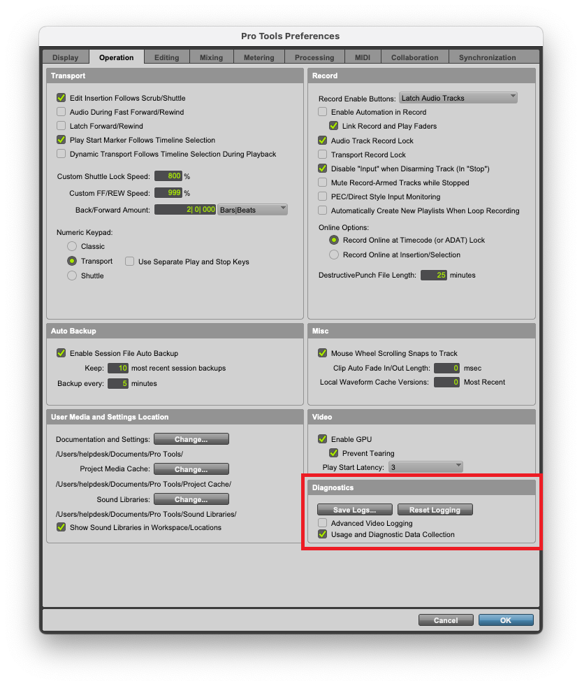 In addition, Pro Tools has diagnostic tools that can be used to diagnose possible issues or problems on your system. To set a diagnostic log on Pro Tools, go to preferences, operation, and diagnosis.