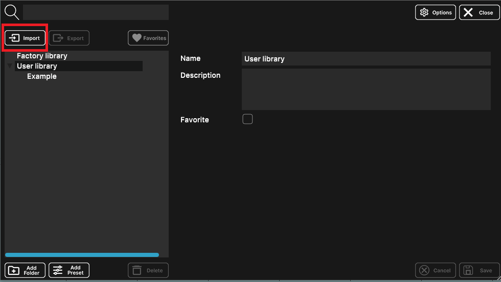 The preset manager allows you to manage factory pre-installed presets and user-created presets. Both preset libraries are stored in single files. However, it is possible to save an individual preset as a separate file and exchange it with other plug-in formats, computers, or users using the export and import functions.
